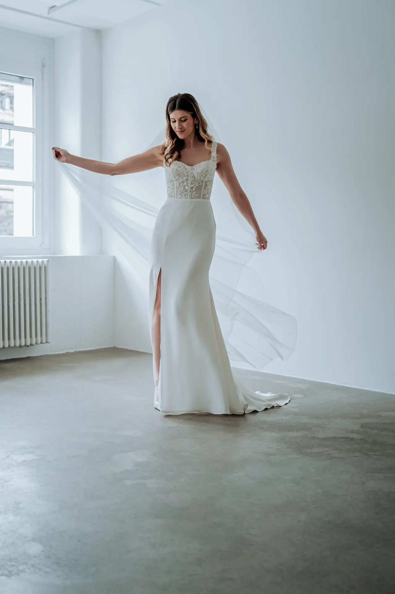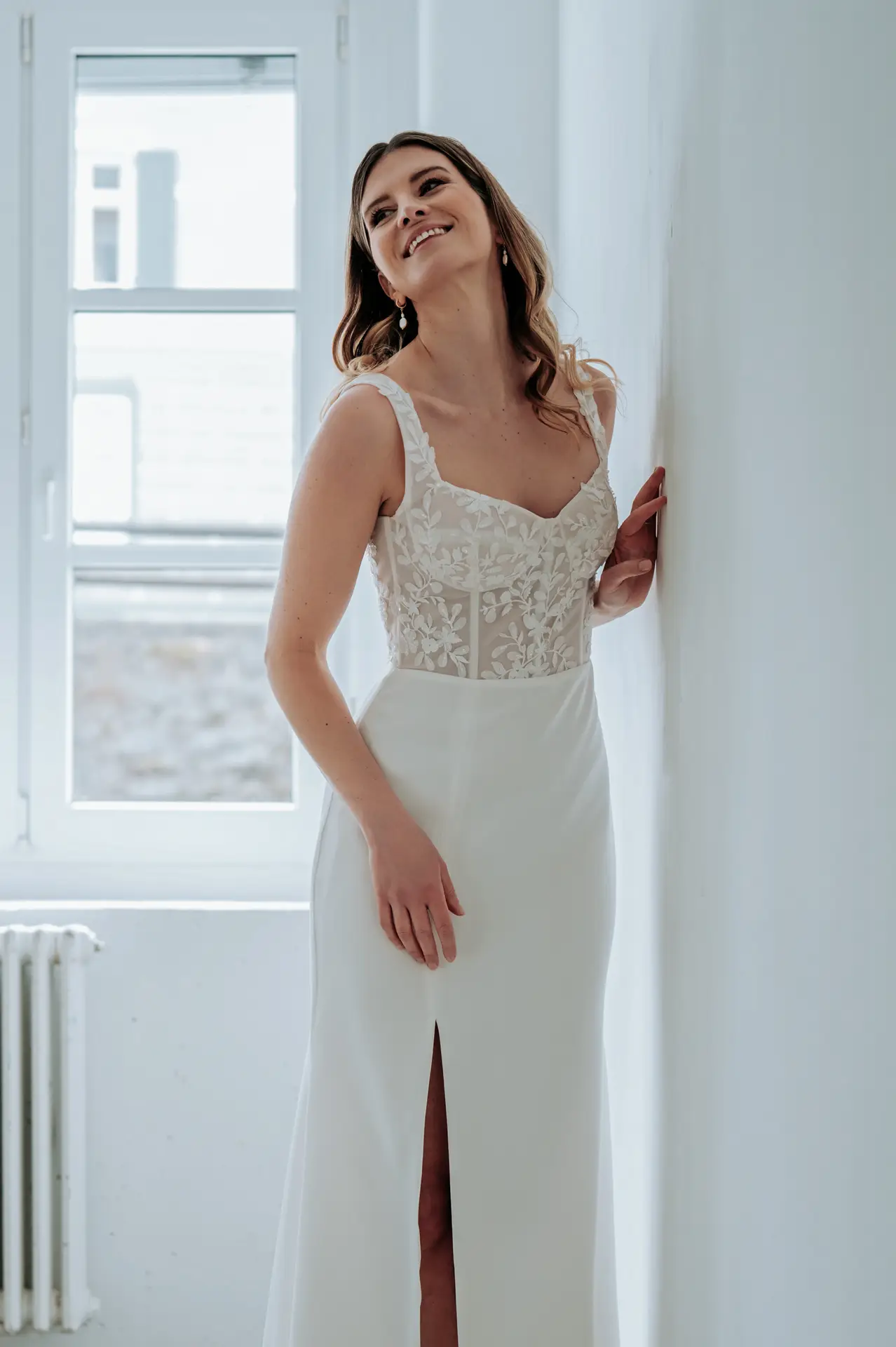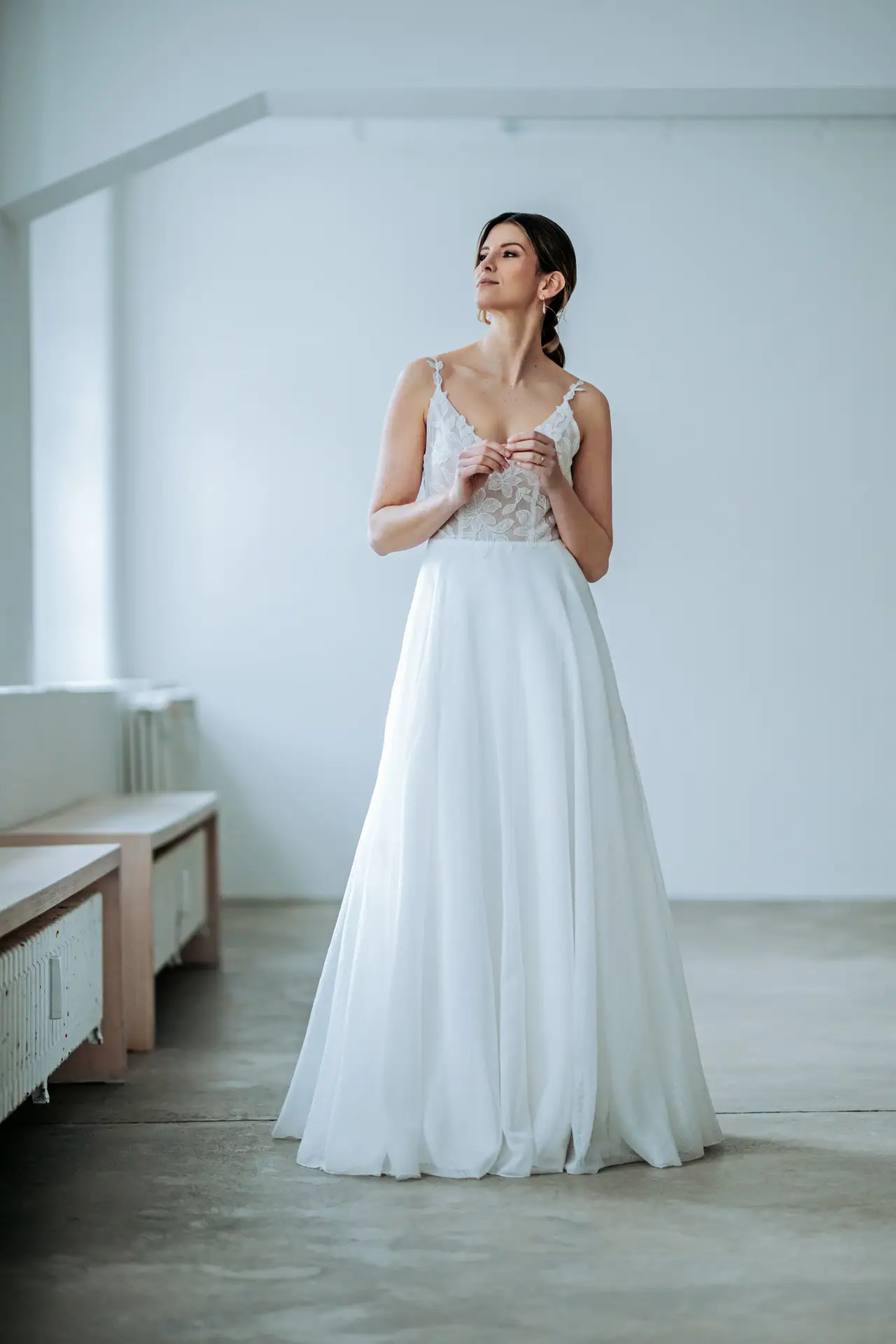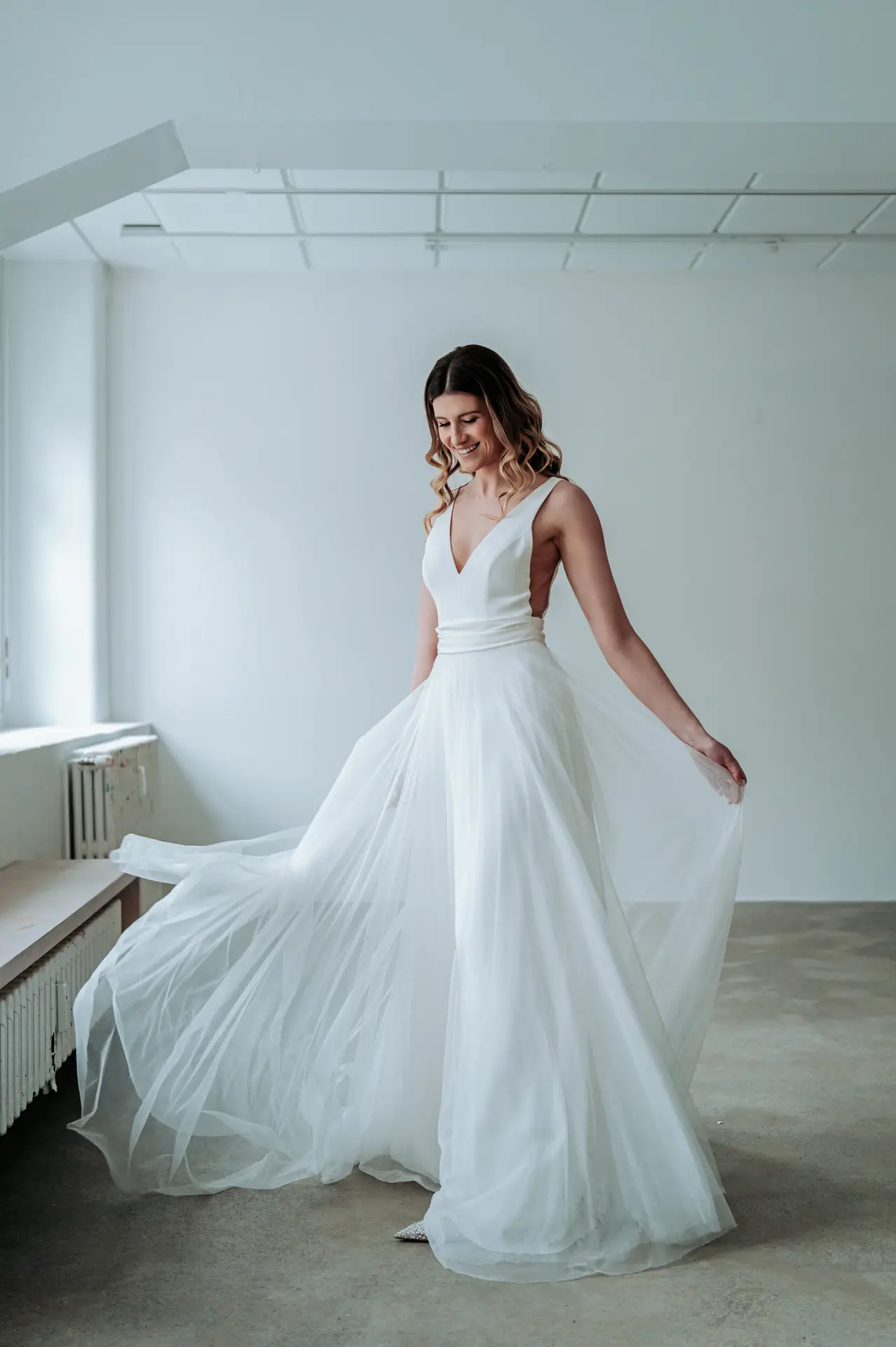 Bei deiner ersten Anprobe stehen dir unterschiedlichste Brautoutfits zur Verfügung. Schlüpfe in das ein oder andere Brautkleid oder probiere aus, ob du dich in einem Zweiteiler wohler fühlst. Die Röcke und Oberteile lassen sich auf verschiedene Weise miteinander kombinieren. Stelle dir deinen Look also einfach INDIVIDUELL zusammen! Das Schöne daran: Du kannst das Ensemble, oder Teile davon, auch nach der Hochzeit noch öfter tragen.